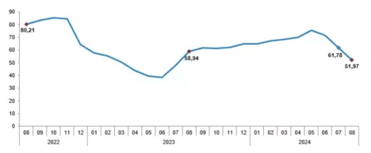 Türkiye İstatistik Kurumu (TÜİK) ağustos ayı enflasyon verilerini kamuoyuyla paylaştı. Ağustos ayında enflasyon bir önceki aya göre %2,47, bir önceki yılın Aralık ayına göre %31,94, bir önceki yılın aynı ayına göre %51,97 ve on iki aylık ortalamalara göre %64,91 olarak gerçekleşti.