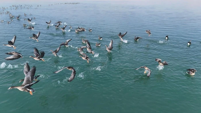 Türkiye'nin önemli sulak alanlarından ve kuş cennetlerinden biri olan Erçek Gölü’nün yeni misafirleri küçük sakarcalar havadan görüntülendi.