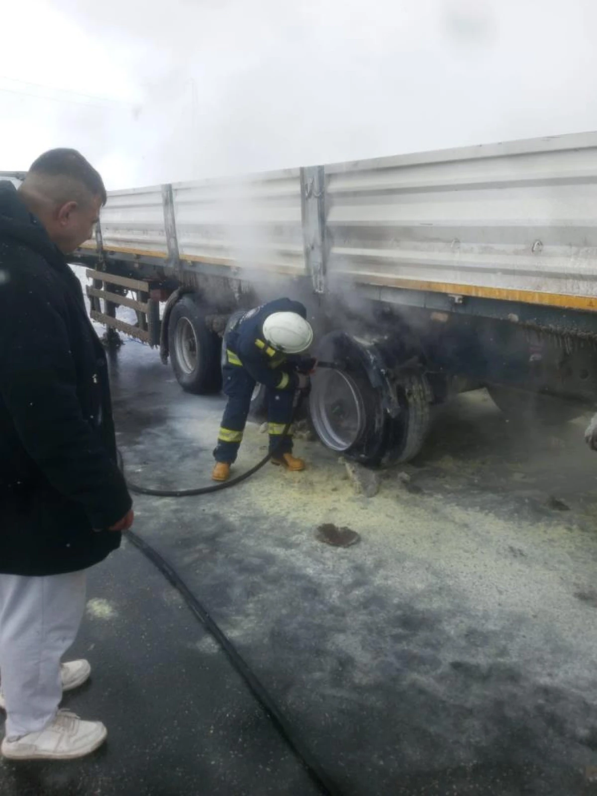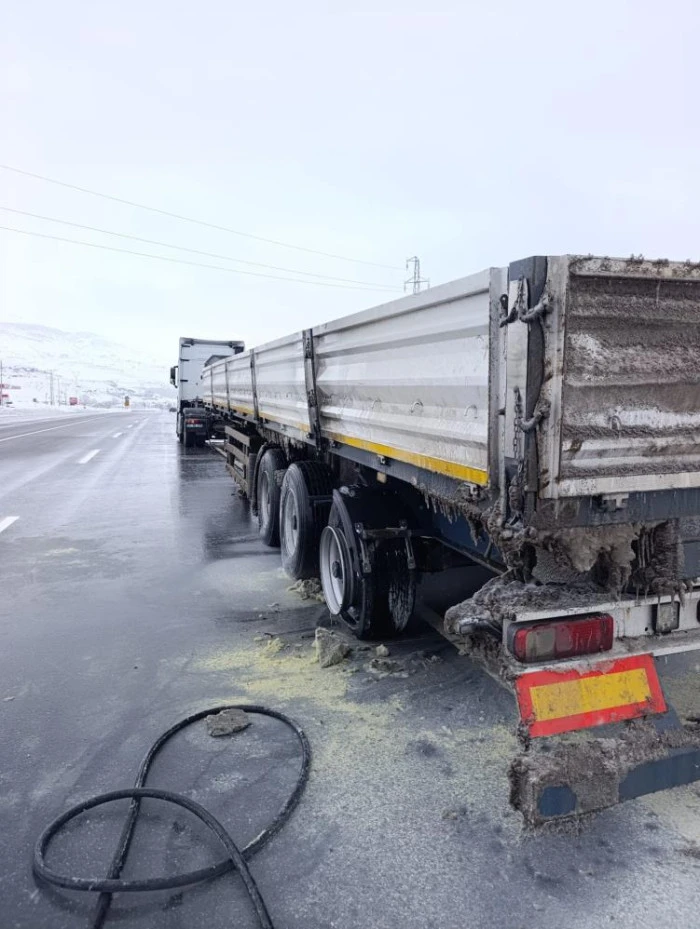 Van-Erciş kara yolunda seyir halindeki tırın yanan lastikleri itfaiye ekipleri tarafından söndürüldü.