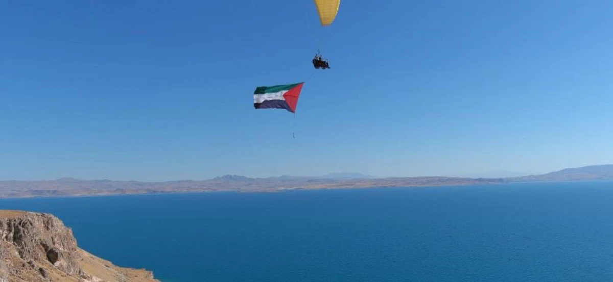 Antalyalı Yamaç Paraşütü Pilotu Mehmet Sadık Göller, takım arkadaşıyla birlikte Van Gölü semalarında Filistin bayrağı açtı.