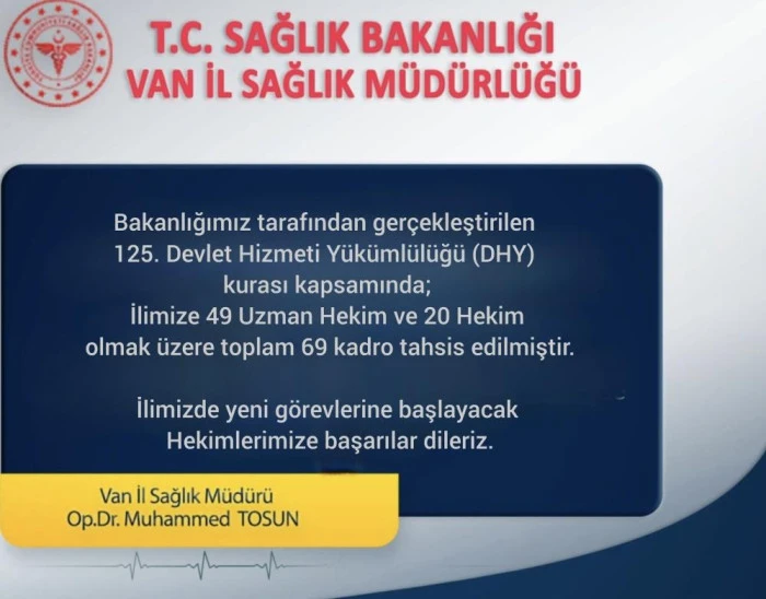 Sağlık Bakanlığınca gerçekleştirilen 125. Devlet Hizmeti Yükümlülüğü (DHY) Kurası kapsamında, Van'a 49 uzman hekim ve 20 hekim olmak üzere toplam 69 yeni kadro tahsis edildi.